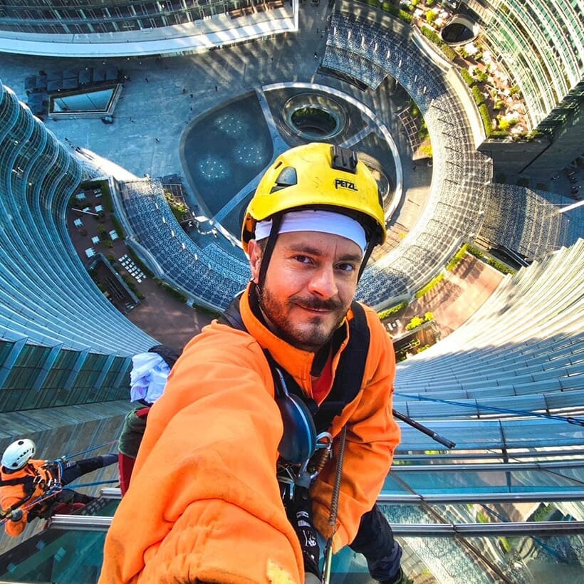 D.H.: Succede spesso. Un giorno ero sul Bosco e si affaccia un famoso allenatore di calcio che offre a tutti un buon caffè. Qualche volta capita anche che qualche bambino ci mostri uno smile disegnato su un foglio attraverso il vetro e allora io ricambio disegnando un saluto come risposta. Amo anche il disegno, oltre che la musica, in Bulgaria suonavo in 5 rockband diverse. Tornando al lavoro, ci sono anche delle persone che ogni tanto ci chiedono di posare con loro per un selfie. Una volta ero all’ultimo piano della Unicredit Tower e, malgrado ci sia il divieto di uscire quando operiamo, vedo un signore elegante che fuma come se niente fosse. E’ stata una sorpresa perché se ad esempio qualcuno calpestasse le nostre corde potrebbe danneggiarle, così gli abbiamo fatto notare che non avrebbe dovuto stare lì e il signore ha tolto molto gentilmente il disturbo. Giorni dopo, in metropolitana, ho visto su un giornale la foto di quell’uomo: era un famoso business man che poi ho incontrato di nuovo e ci siamo salutati, una bella esperienza.