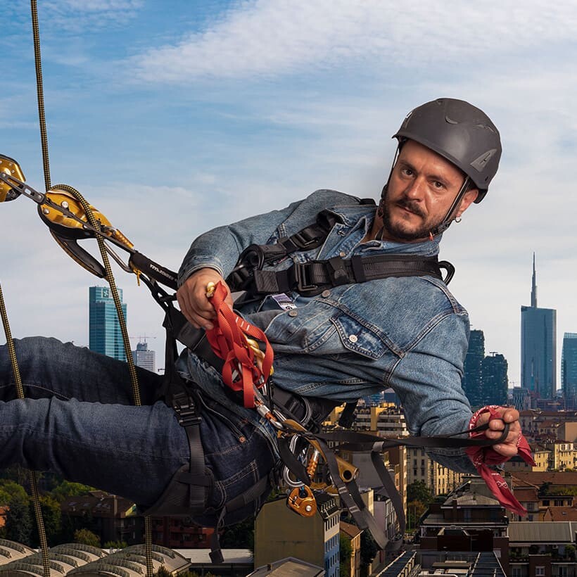 D.H.: È specifica per il lavoro, non per la montagna come molti credono. Ogni dispositivo ha due step di sicurezza, con uno di riserva. Il nostro imbrago è integrale, in arrampicata sportiva invece è parziale. I moschettoni vanno da 5 a 30, a seconda dell’intervento. Poi abbiamo bloccanti, dispositivi anticaduta… Le corde le assicuriamo a dei punti già presenti sugli edifici mentre gli attrezzi del mestiere li carico nello zaino.
