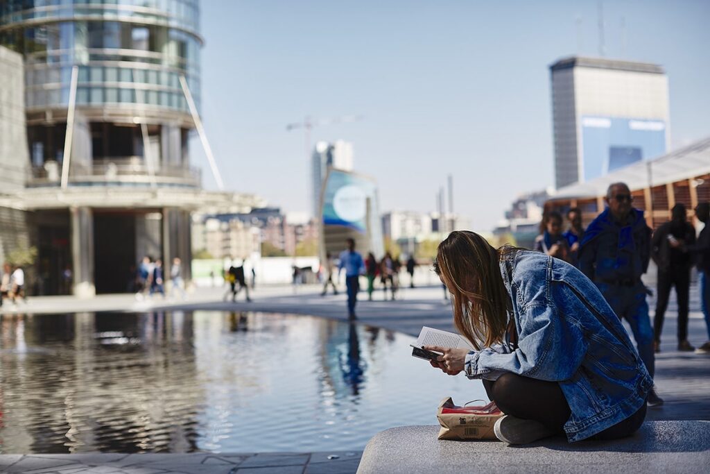 L’attenzione di Portanuova è così rivolta alla necessità di riportare le persone a vivere gli ambienti esterni. Un cambio di prospettiva che si traduce in un vero e proprio cambiamento culturale: Portanuova è strutturata anche per essere attraversata, camminata, grazie a un sistema pedonale continuo, ad aree verdi, piazze e passerelle, mentre le automobili diventano “invisibili”. Grazie all’uso di legno naturale e di vetro riflettente il cielo, gli spazi esterni sembrano ampliarsi e donarci una sensazione di leggerezza e libertà. Uno dei simboli di questa nuova vision di architettura a misura d’uomo è piazza Gae Aulenti, una piazza da ascoltare, oltre che da ammirare, dove sostare al suono leggero dell’acqua della fontana, per poi ascoltare le voci del quartiere amplificate dalla scultura permanente Egg di Alberto Garutti. Anche per questo, Portanuova è un quartiere umano: un quartiere dedicato a chi sa ascoltare.